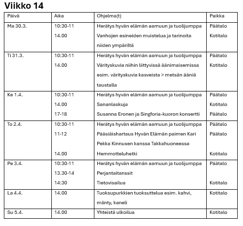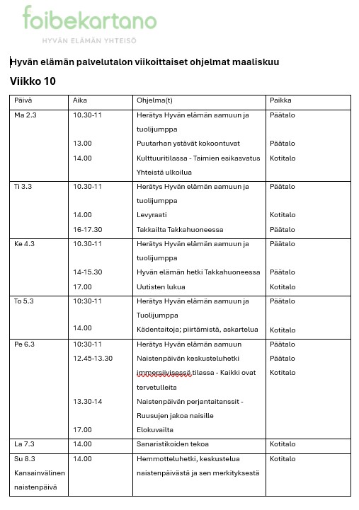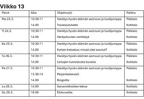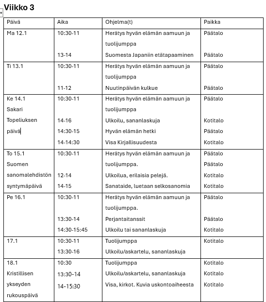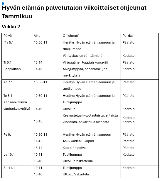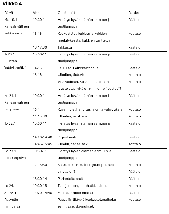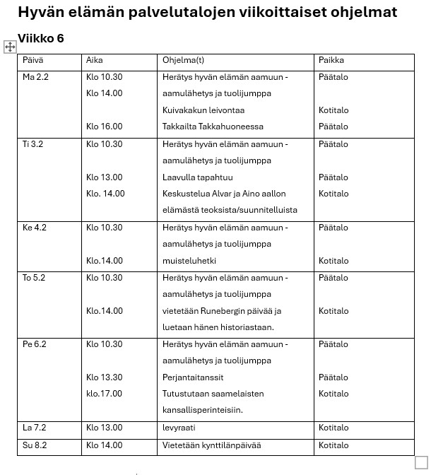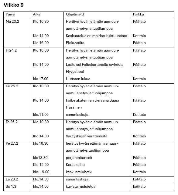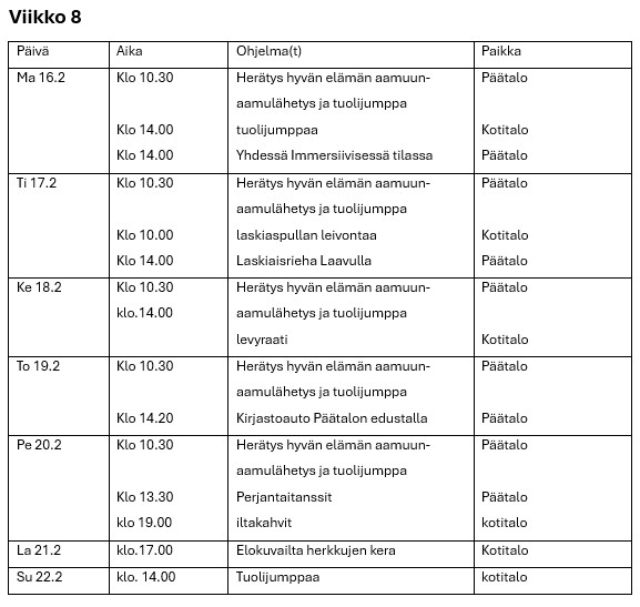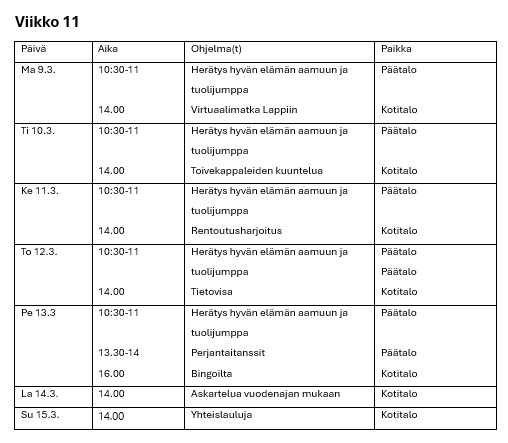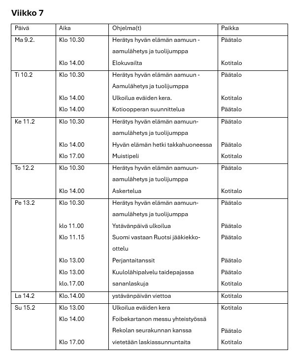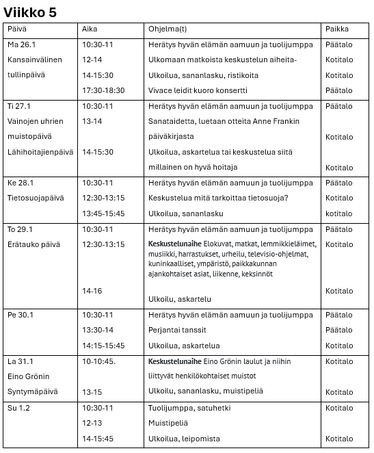 Hyvän elämän palvelutalon viikko-ohjelmat